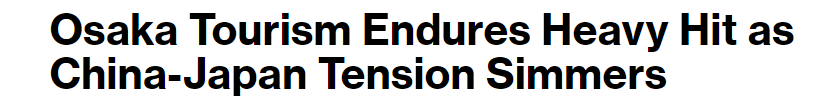 彭博社12月10日发表文章称,日本首相高市早苗涉台不实言论导致中日关系遇冷,并影响到包括大阪在内的整个日本旅游市场。文章称,中国游客大幅减少将对日本旅游业乃至整体经济产生深远的负面影响。彭博社报道截图 文章首先讲述了一位在日本大阪市经营着近80处度假租赁物业的旅游业从业者的经历。该从业者表示,截至目前,已有600多份订单被取消,涉及1000多名中国游客。 “我认识的房地产和旅游业的每个人都在苦苦挣扎,”他说。他认为,如果这种趋势持续下去,可能会演变为更大程度的宏观危机。彭博社报道截图 文章称,大阪是日本第二大经济中心,其经济活力密切相关与旅游业有关。特别是近年来,中国游客是推动当地旅游消费的重要力量。但现在,这座城市引进的中国游客越来越少:大阪关西国际机场的航班削减幅度为全国之最,当地酒店、零售商和餐馆也面临大面积取消航班的情况。 2025年4月大阪世博会期间的“高达未来馆”。(彭博社图片)文章指出,今年早些时候,举办2025年大阪世博会促进了该地区旅游业的发展。然而,今天的情况发生了重大变化。在心斋桥和新世界地区,中国游客明显减少,旅游巴士消失,餐馆的中国顾客也减少。大阪观光局近期发布的调查显示,中国游客取消订单直接影响了酒店业及相关服务难波、大阪等热门旅游区的产业。 文章援引新加坡市场研究公司China Trading Desk的数据称,明年冬季和早春从中国飞往大阪的机票预订量下降了55%至65%,其中关西国际机场的取消比例尤其高。文章指出,高市早苗虚假谈台后,中国赴日游客大幅下降,极大影响了日本经济为数不多的小领域之一的旅游业,也将对日本经济产生负面影响。彭博社截图报道,日本综合研究所经济学家小宫宏武的文章称,随着中国农历新年的临近,预计日本的冷遇、滑雪场等热门冬季旅游项目可能会受到冷遇。如果这种情况持续下去,日本的经济损失2026年可能达到1.2万亿日元(约合人民币541亿元)。彭博社报道截图。文章还援引China Trading Desk首席执行官兼创始人苏布拉马尼亚·巴特(Subramania Bhatt)的话说:“对于日本旅游业,尤其是大阪这样的地方来说,将中国视为长期可靠增长引擎的时代已经结束。”来源 | P 中国交易台编译 | 王菲,审稿人 |杨卓英,生产商|刘一耀
